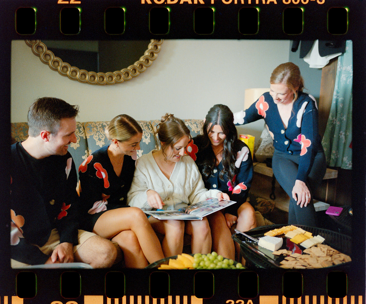 Helen and her bridesmaids hung out flipping through an old photo album, remembering past weddings, trips, college. Characteristically the groom’s side was more chaotic. A doordashed beer delivery as Kevin was getting dressed, the groomsmen piling into the bathtub for a photo, the hotel rooms’ TVs playing fall football.