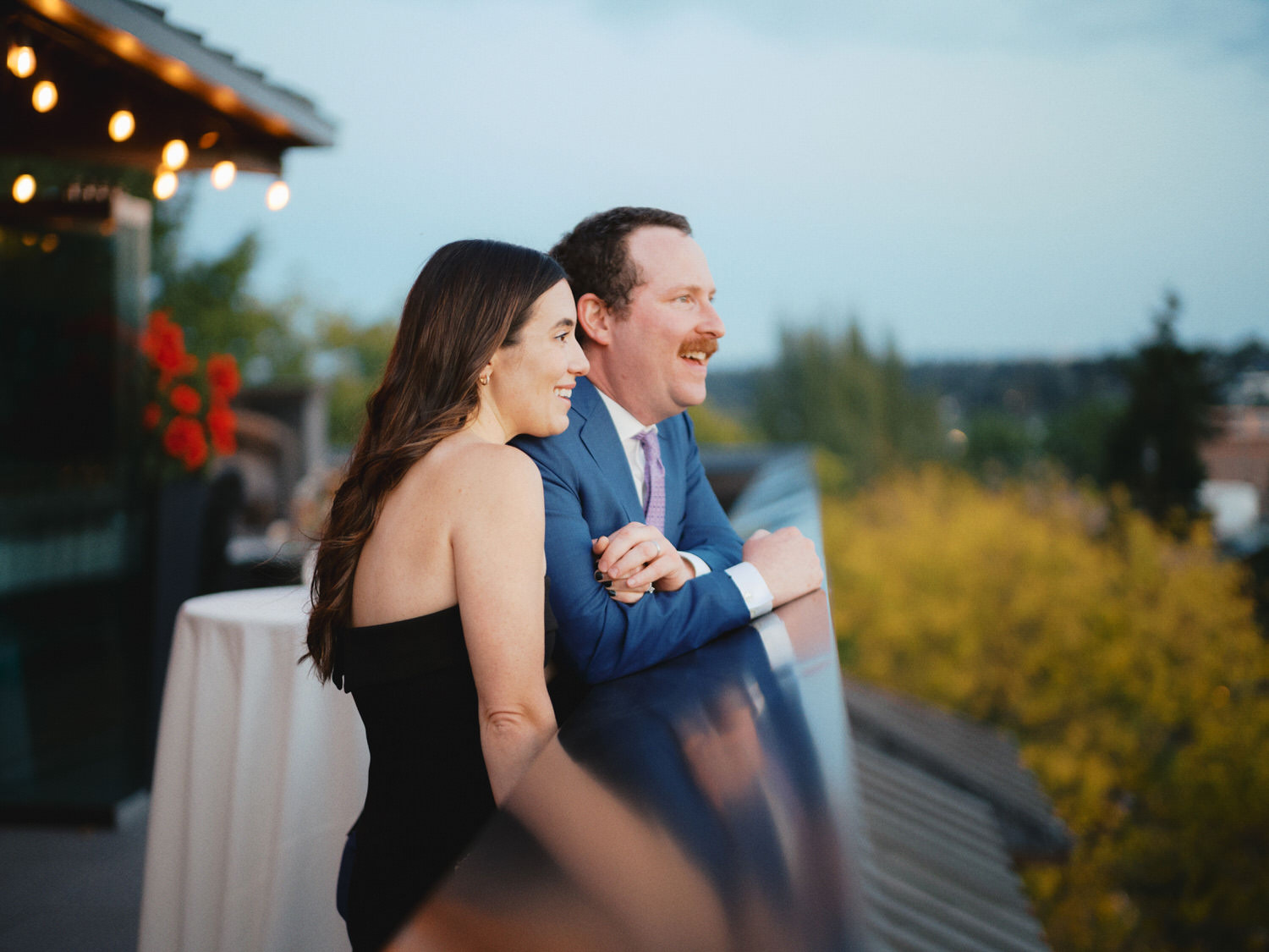 The cocktail hour began in the hotel lobby and everything loosened. Conversations overlapped. People moved in clusters, then broke apart, then found each other again. Back on the roof a few people stepped away from it all. Leaning on the railing, watching the light shift over the city.