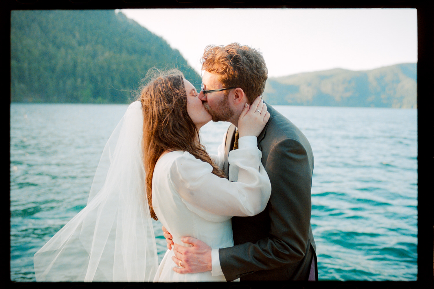 The first look was quick and casual on the Lake Crescent Shoreline, followed by few portraits and family photos. Then it was time for the wedding ceremony on the beach, the wind catching Sara’ veil constantly. Afterwards the couple sprinted for their cabin, immediately grabbing each other for a kiss of relief, the tension of the year of preparation melting away.